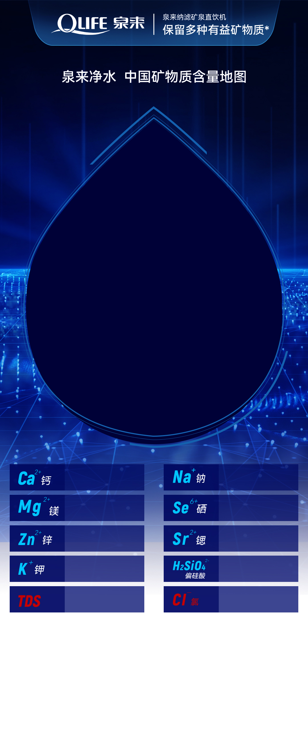 * 泉來采用美國進口納濾膜,含有納濾濾芯的凈水器機型,原水通過納濾膜后,能保留鉀、鈣、鈉、鎂、鋅、硒、鍶、偏硅酸等礦物質和微量元素;各城市礦物質數據以城市表格內數據為準